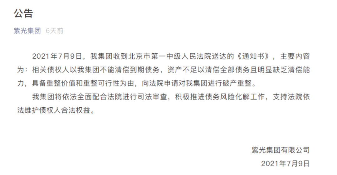 7月9日,紫光集团发布消息称,债权人以紫光集团不能清偿到期债务,资产不足以清偿全部债务且明显缺乏清偿能力为由,向法院申请对集团进行破产重整。对此,紫光集团的态度是支持法院介入,将积极配合推进债务风险化解。
